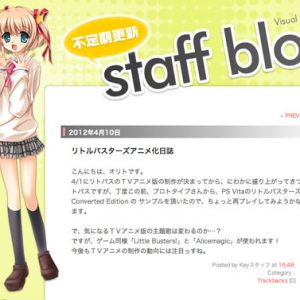 Keys staff blog har bekræftet at den kommende Little Busters! (リトルバスターズ!) anime adaption af J.C. Staff vil bibeholde åbnings og slutsangen der blev brugt i visual novel spillet. Titlen på åbningen er “Little Busters” medens slutningen er “Alicemagic”.