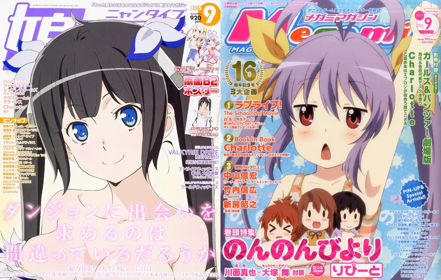 Her er scans af pinup siderne i september 2015 numrene af Nyantype og Megami magasinerne. Det er primært aktuelle serier fra dette års sommer animeer.